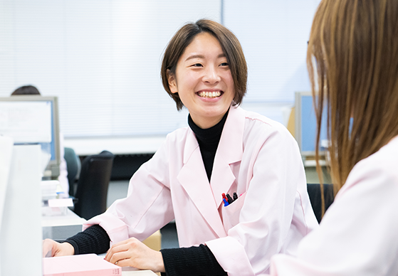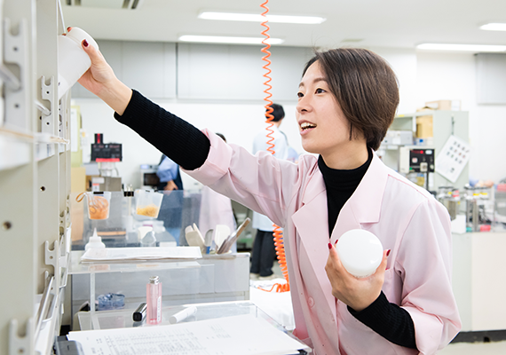 私の部署は処方設計(企画された商品を量産するための設計)ですが、開発の要素や機会も多い職場です。決められた商品の開発だけではなく、自分なりの研究テーマを追求する時間もあります。例えば、個人で1年ごとに「年間テーマ」を設定して研究に取り組むことができます。新しい処方に取り組んで発表したり、実際にお客様に提案したりもできます。「開発部にいなくても開発の機会がある」というのは大きな魅力です。